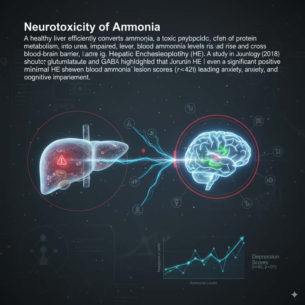 A healthy liver efficiently converts ammonia, a toxic byproduct of protein metabolism, into urea. When liver function is impaired, blood ammonia levels rise and cross the blood-brain barrier, leading to Hepatic Encephalopathy (HE). In the brain, ammonia disrupts neurotransmitter balance, particularly glutamate and GABA. A study in the Journal of Hepatology (2018) highlighted that even minimal HE shows a significant positive correlation between blood ammonia levels and depression scores (r=0.42, p<0.01), leading to anxiety, apathy, and cognitive impairment.