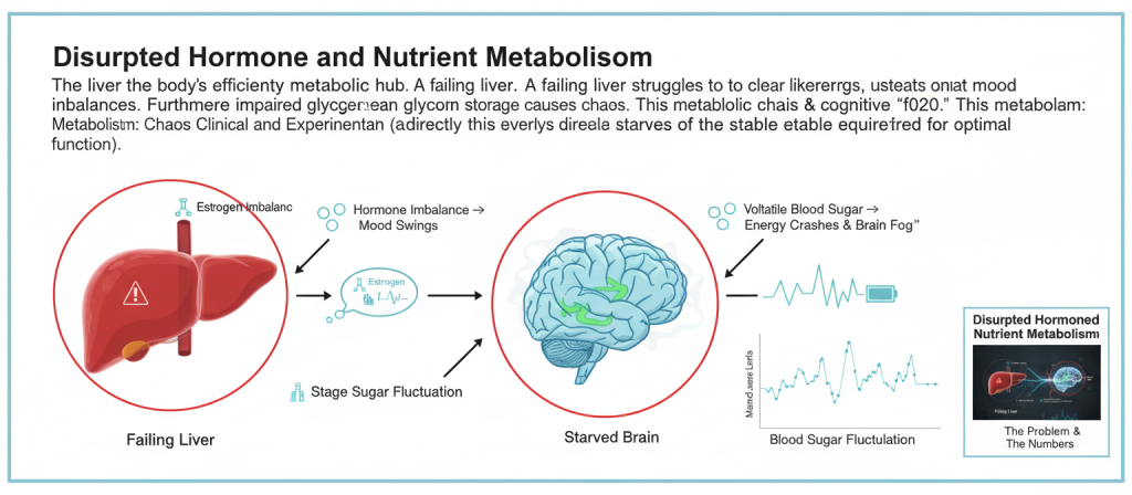 The liver is the body’s primary metabolic hub. A failing liver struggles to clear hormones like estrogen, leading to imbalances that can manifest as mood swings. Furthermore, impaired glycogen storage causes volatile blood sugar, leading to energy crashes and cognitive “fog.” This metabolic chaos, documented in Metabolism: Clinical and Experimental (2020), directly starves the brain of the stable energy required for optimal function.