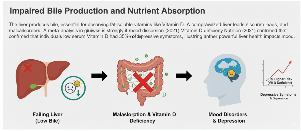 The liver produces bile, essential for absorbing fat-soluble vitamins like Vitamin D. A compromised liver leads to malabsorption, and Vitamin D deficiency is strongly linked to mood disorders. A meta-analysis in the American Journal of Clinical Nutrition (2021) confirmed that individuals with low serum Vitamin D had a 35% higher risk of depressive symptoms, illustrating another powerful way liver health impacts mood.