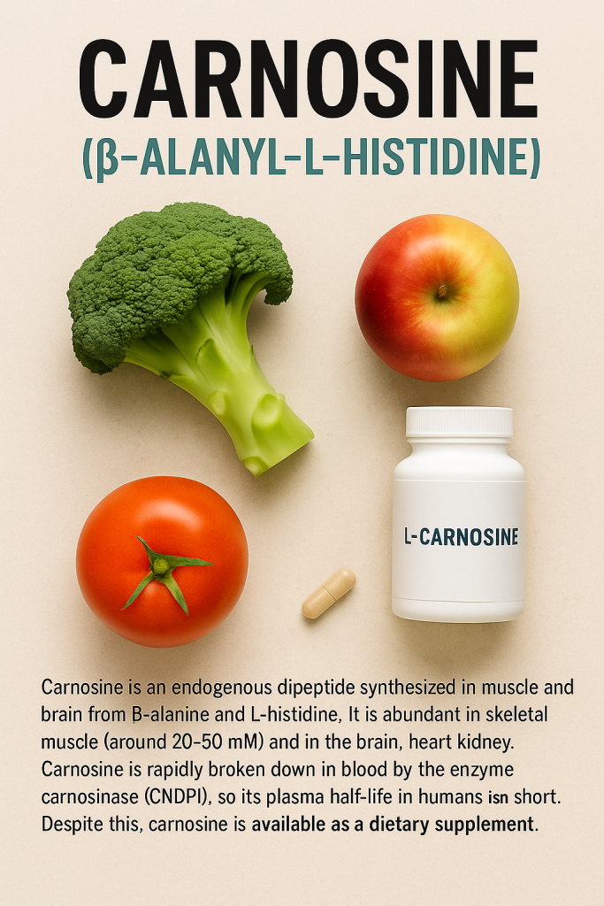 Carnosine (β-alanyl-L-histidine) is an endogenous dipeptide synthesized in muscle and brain from β-alanine and L-histidinemdpi.com. It is abundant in skeletal muscle (around 20–50 mM) and in the brain, heart and kidney. Carnosine is rapidly broken down in blood by the enzyme carnosinase (CNDP1), so its plasma half-life in humans is shortpubmed.ncbi.nlm.nih.gov. Despite this, carnosine is available as a dietary supplement and can be boosted in tissues by precursors (e.g. β-alanine) or by formulations designed to resist degradation. As a supplement, carnosine is claimed to act as an antioxidant, antiglycator and anti-inflammatory molecule. Indeed, carnosine “is a naturally occurring… dipeptide with a well-demonstrated multimodal mechanism of action that includes the detoxification of reactive oxygen and nitrogen species and the down-regulation of pro-inflammatory mediators”mdpi.com. It also chelates metals and can inhibit abnormal protein aggregationmdpi.com. Research suggests carnosine may influence metabolic and immune pathways beyond muscle, including in kidney and vascular cellspubmed.ncbi.nlm.nih.govmdpi.com.