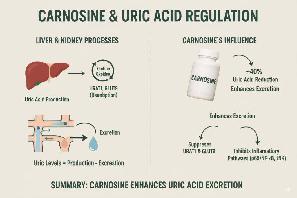 These multiple actions are synergistic: by simultaneously reducing inflammation and boosting uric acid elimination, carnosine could both alleviate acute attacks and lower chronic uric acid burden.