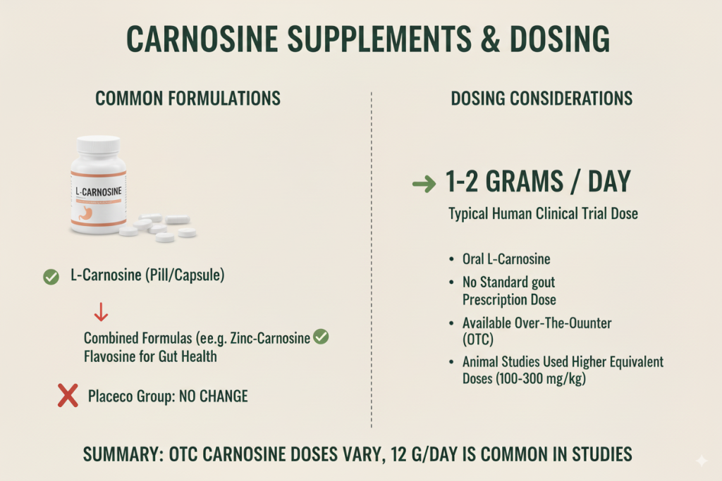 For patients considering carnosine supplements, several formulations exist. L-carnosine is typically taken orally in pill or capsule form. Doses in studies range widely; animal research often uses equivalent of 100–300 mg/kg (translating to grams per day for humans), but clinical trials often use 1–2 grams per day of L-carnosine. There is no standard prescription dose for gout. Carnosine is available over-the-counter, and is sometimes combined with other antioxidants or minerals (e.g. zinc-carnosine for gut health, though zinc-carnosine is a different compound mainly used for ulcers).