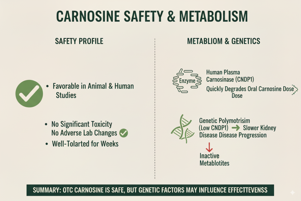 Carnosine’s safety profile appears favorable. In both animal studies and limited human trials, no significant toxicity or adverse lab changes were reportedpubs.sciepub.com. Human volunteers have taken carnosine for weeks without issues. However, one consideration is that human plasma carnosinase (CNDP1) quickly degrades circulating carnosine. This means much of an oral dose may be broken down before reaching tissues. Some people have genetic differences in carnosinase activity; one review of diabetic nephropathy notes that a common CNDP1 polymorphism (which lowers carnosinase) is associated with slower kidney disease progressionpubmed.ncbi.nlm.nih.gov. This suggests individuals who naturally preserve carnosine better may experience more benefit.