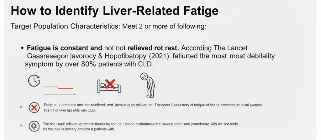 Fatigue is constant and not relieved by rest. According to The Lancet Gastroenterology & Hepatology (2021), fatigue is reported as the most debilitating symptom by over 80% of patients with CLD.