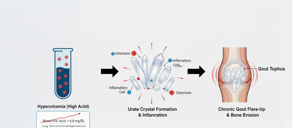 Gout tophi are the direct result of long-term, uncontrolled hyperuricemia (high uric acid). When the concentration of uric acid in the blood consistently exceeds its saturation point (around 6.8 mg/dL), it begins to crystallize. These deposits are not inert; they are biologically active granulomas that actively promote inflammation and bone erosion by recruiting inflammatory cells and osteoclasts. As these crystals accumulate, the body’s immune system attacks them, triggering the intensely painful flare-ups characteristic of gout. After repeated attacks, the urate crystals become encapsulated by fibrous tissue, forming hard, chalky nodules—the tophus.