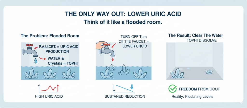 Think of it like a flooded room. The faucet (your body’s uric acid production) is leaking, and the water on the floor (the tophi) is getting deeper.