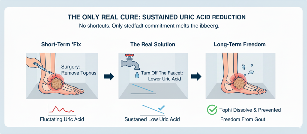 There are no shortcuts in the treatment of gout tophi. Surgery can solve an immediate crisis, but only a steadfast commitment to maintaining low, stable uric acid levels can truly melt the iceberg and clear the source. This is the only evidence-based way to make tophi a thing of the past and prevent their devastating return.
