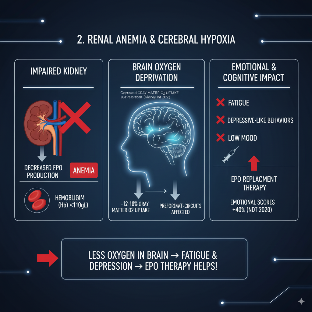 Decreased kidney function leads to reduced erythropoietin (EPO) production, causing hemoglobin (Hb) levels to fall below 110g/L (WHO standard for anemia). This results in a 12-18% reduction in gray matter oxygen uptake (Kidney Int 2021), directly affecting the prefrontal-limbic neural circuits and inducing feelings of fatigue and depressive-like behaviors. EPO replacement therapy has been shown to improve emotional dimension scores by 40% (NDT 2020).