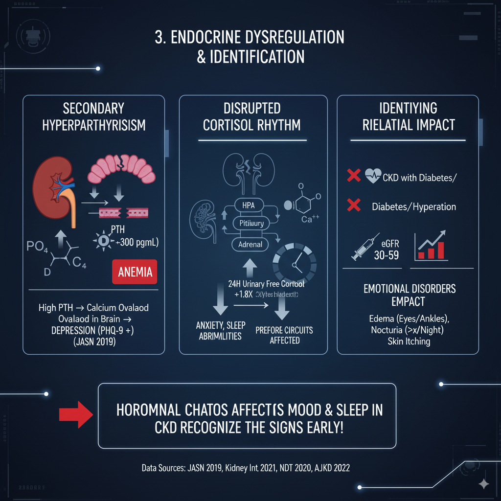 Secondary Hyperparathyroidism: Elevated serum phosphate (>1.45mmol/L) and active vitamin D deficiency stimulate excessive parathyroid hormone (PTH) secretion. PTH levels above 300pg/mL correlate positively with depression scores (PHQ-9) (r=0.36, p<0.01), as PTH can increase the permeability of the blood-brain barrier to calcium, leading to hippocampal calcium overload. Disrupted Cortisol Rhythm: CKD patients exhibit a 1.8-fold increase in 24-hour urinary free cortisol, disrupting the negative feedback regulation of the HPA axis. This can result in anxiety and abnormal sleep-wake cycles. How to Identify Kidney-Related Emotional Impact Target Population Characteristics: Meet 2 or more of the following: CKD patients with co-existing diabetes and/or hypertension. Patients with eGFR Stage 3-4 (30-59 mL/min/1.73m²) have a 2.3 times higher incidence of emotional disorders compared to the general population (AJKD 2022). Presence of edema (eyelids/ankles), nocturia (waking to urinate >2 times/night), or skin itching.