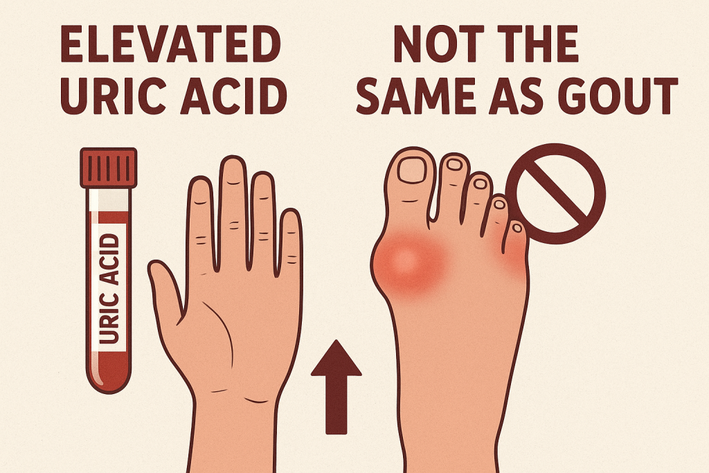 - What’s Happening: Your blood tests show elevated uric acid levels, but you feel completely fine. You have no joint pain, no swelling, and no symptoms of gout.